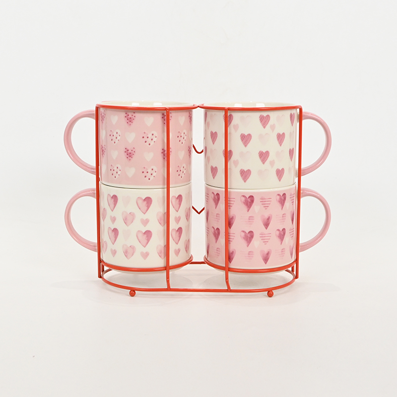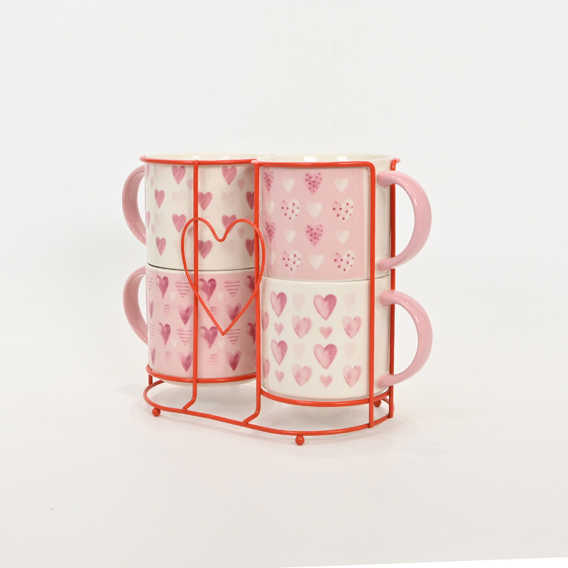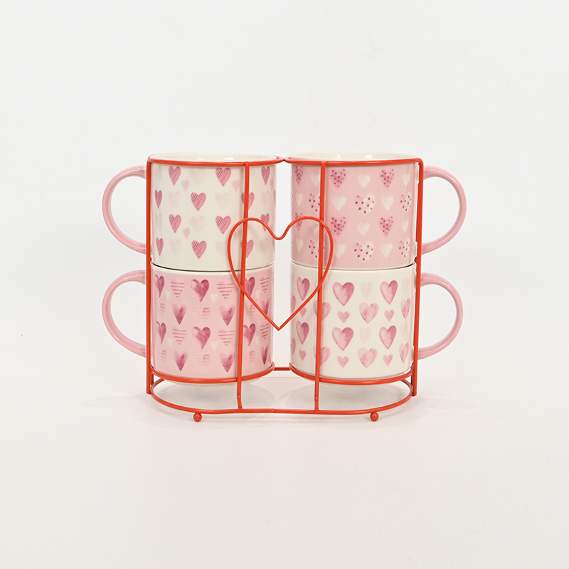 Valentine's Day themed ceramic mugs. A set of four pink-handled cups covered